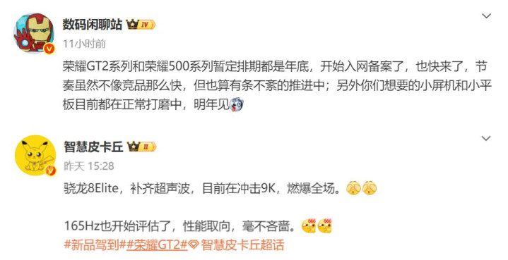 据悉,荣耀GT2系列将搭载了高通骁龙8 Elite,虽然是次旗舰芯片,但是主流游戏的运行上,是不会有什么问题的。